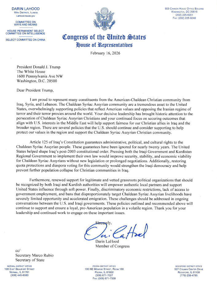 Central to the congressman’s appeal is Article 125 of Iraq’s Constitution, which guarantees administrative, political, and cultural rights to the Chaldean Syriac Assyrian people. According to LaHood, those protections have gone largely unimplemented for nearly two decades. LaHood's letter follows strong advocacy for Article 125 by the Chaldean Community Foundation, the Assyrian American National Federation, Vote Assyrian, and the Assyrian American Chamber of Commerce.