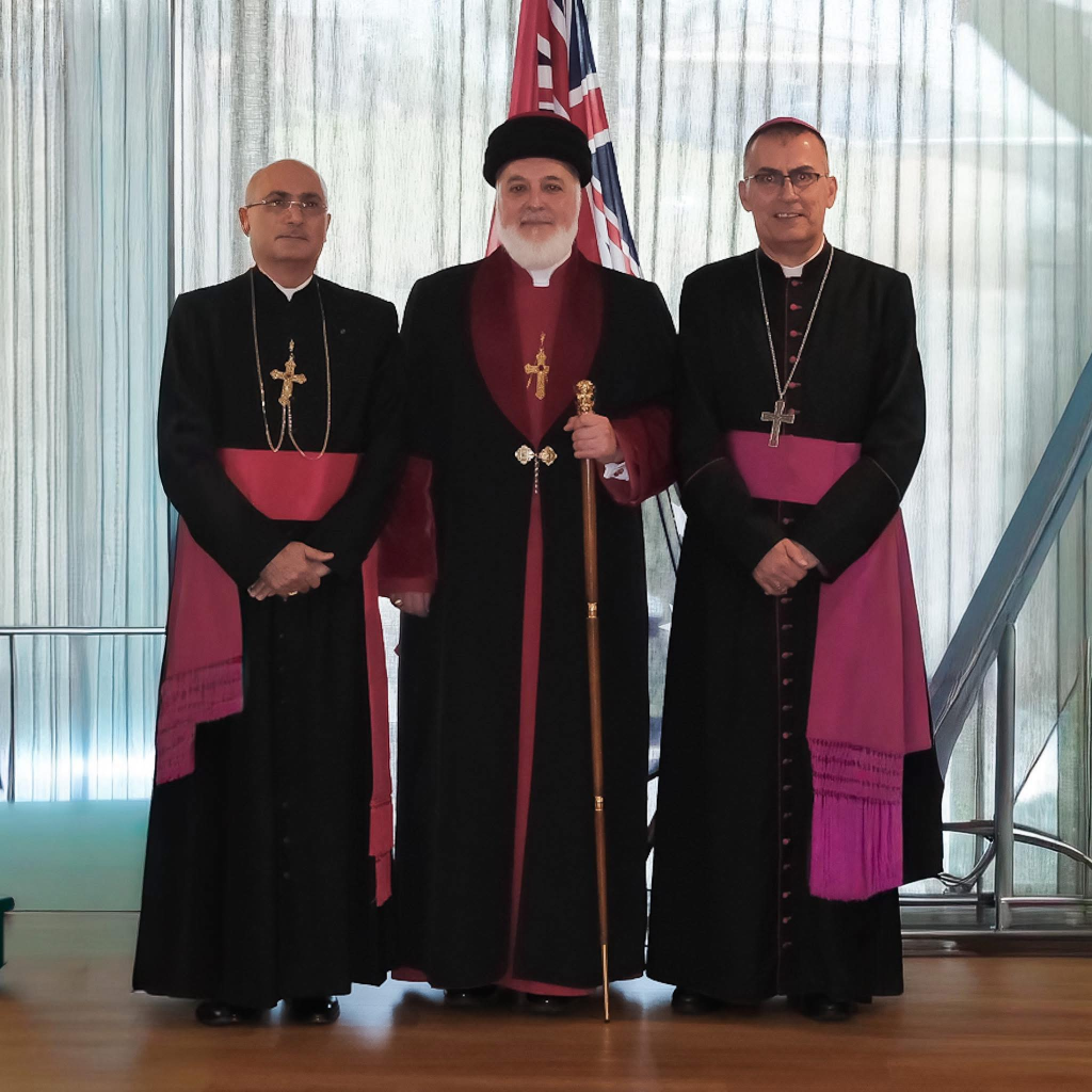 His Holiness Mar Awa III, Patriarch of the Assyrian Church of the East, flanked by his Beatitude (now Patriarch) Mar Paulus III Nona and His Beatitude Meelis Zaia, the Archbishop of the Assyrian Church of the East in Australia.